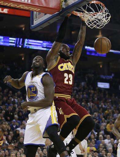 Cleveland Cavaliers' LeBron James, right, scores over Golden State Warriors' Draymond Green during the first half of an NBA basketball game, Monday, Jan. 16, 2017, in Oakland, Calif. (AP Photo/Ben Margot) The Associated Press