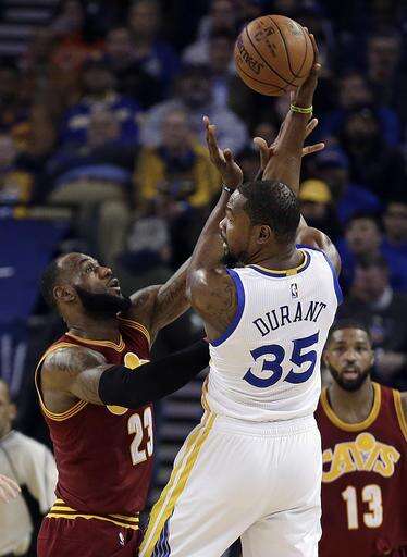 Golden State Warriors' Kevin Durant, left, defends against Cleveland Cavaliers' LeBron James during the first half of an NBA basketball game, Monday, Jan. 16, 2017, in Oakland, Calif. (AP Photo/Ben Margot) The Associated Press
