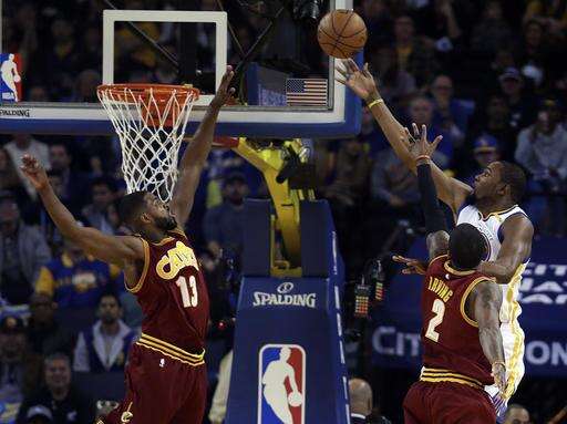 Golden State Warriors' Kevin Durant, right, lays up a shot against Cleveland Cavaliers' Tristan Thompson, left, and Kyrie Irving (2) during the first half of an NBA basketball game Monday, Jan. 16, 2017, in Oakland, Calif. (AP Photo/Ben Margot) The Associated Press