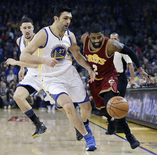 Cleveland Cavaliers' Kyrie Irving, right, and Golden State Warriors' Zaza Pachulia (27) chase a loose ball during the first half of an NBA basketball game Monday, Jan. 16, 2017, in Oakland, Calif. (AP Photo/Ben Margot) The Associated Press