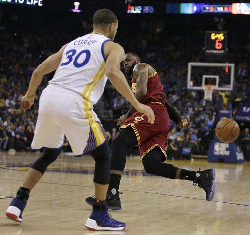 Cleveland Cavaliers' LeBron James passes behind his back away from Golden State Warriors' Stephen Curry (30) during the first half of an NBA basketball game Monday, Jan. 16, 2017, in Oakland, Calif. (AP Photo/Ben Margot) The Associated Press
