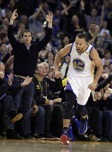Golden State Warriors' Stephen Curry celebrates a score against the Cleveland Cavaliers during the first half of an NBA basketball game Monday, Jan. 16, 2017, in Oakland, Calif. (AP Photo/Ben Margot) The Associated Press