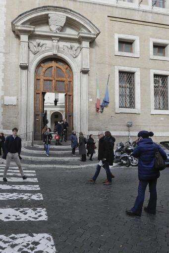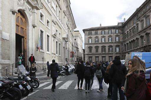 People stand outside an evacuated school after three earthquakes hit central Italy in the space of an hour, shaking the same region that suffered a series of deadly quakes last year, in Rome, Wednesday, Jan. 18, 2017. (AP Photo/Gregorio Borgia)