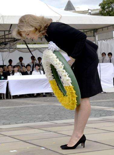 FILE - In this Aug. 9, 2014, file photo, U.S. Ambassador to Japan Caroline Kennedy greets attendants as she offers flowers to the atomic bomb victims during a ceremony at Nagasaki Peace Park in Nagasaki, southern Japan. Kennedy is stepping down Wednesday, Jan. 18, 2017 after three years as U.S. ambassador to Japan, where she was welcomed like a celebrity and worked to deepen the U.S.-Japan relationship despite regular flare-ups over American military bases on the southern island of Okinawa. (Kyodo News via AP, File)