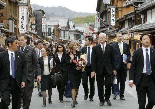 FILE - In this April 16, 2014, file photo, U.S. Ambassador to Japan Caroline Kennedy, center, and her husband Edwin Arthur Schlossberg, center right, walk on a souvenir shopping street, outside of Ise Grand Shrine in Ise, Mie Prefecture, Japa. Kennedy is stepping down Wednesday, Jan. 18, 2017 after three years as U.S. ambassador to Japan, where she was welcomed like a celebrity and worked to deepen the U.S.-Japan relationship despite regular flare-ups over American military bases on the southern island of Okinawa. (AP Photo/Shizuo Kambayashi, File)