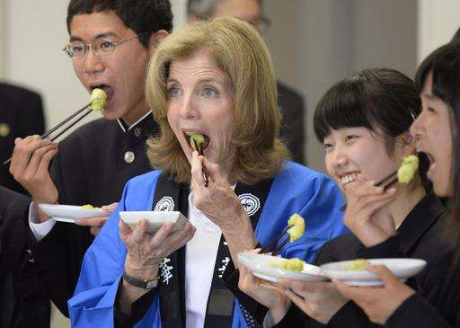 FILE - In this May 13, 2014, file photo, U.S. Ambassador to Japan Caroline Kennedy, center, tries a local specialty, sweet rice cakes she made with students at a high school in Sendai, Miyagi Prefecture, northeastern Japan. Kennedy is stepping down Wednesday, Jan. 18, 2017 after three years as U.S. ambassador to Japan, where she was welcomed like a celebrity and worked to deepen the U.S.-Japan relationship despite regular flare-ups over American military bases on the southern island of Okinawa. (Kyodo News via AP, File)