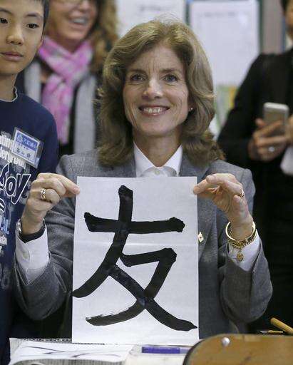 FILE - In this Nov. 25, 2013, file photo, new U.S. Ambassador to Japan Caroline Kennedy shows her work of the Japanese word of "friends" as she attends a calligraphy lesson with children at Mangokuura Elementary School in Ishinomaki, Miyagi prefecture, northeastern Japan. Kennedy is stepping down Wednesday, Jan. 18, 2017 after three years as U.S. ambassador to Japan, where she was welcomed like a celebrity and worked to deepen the U.S.-Japan relationship despite regular flare-ups over American military bases on the southern island of Okinawa. (AP Photo/Shizuo Kambayashi, File)
