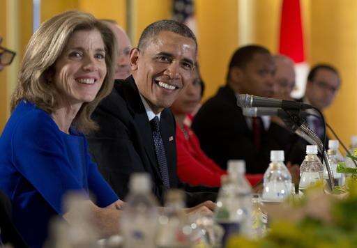 FILE - In this April 24, 2014, file photo, President Barack Obama sits with U.S. Ambassador to Japan Caroline Kennedy, left, during a bilateral meeting with Japanese Prime Minister Shinzo Abe at the Akasaka State Guest House in Tokyo. Kennedy is stepping down Wednesday, Jan. 18, 2017 after three years as U.S. ambassador to Japan, where she was welcomed like a celebrity and worked to deepen the U.S.-Japan relationship despite regular flare-ups over American military bases on the southern island of Okinawa. (AP Photo/Carolyn Kaster, File)