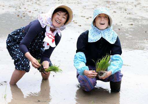 FILE - In this June 14, 2015, file photo, U.S. Ambassador to Japan Caroline Kennedy, right, and Akie Abe, wife of Japanese Prime Minister Shinzo Abe, wearing "Monpe," or work pants for women, prepare for rice planting, in Shimonoseki, western Japan. Kennedy is stepping down Wednesday, Jan. 18, 2017 after three years as U.S. ambassador to Japan, where she was welcomed like a celebrity and worked to deepen the U.S.-Japan relationship despite regular flare-ups over American military bases on the southern island of Okinawa. (Kyodo News via AP, FIle)