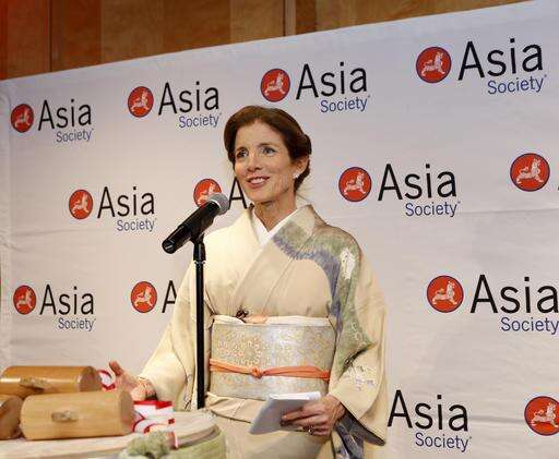 FILE - In this Feb. 11, 2016, file photo, U.S. Ambassador to Japan Caroline Kennedy speaks before a sake barrel breaking ceremony commemorating the opening of the exhibition, "Kamakura: Realism and Spirituality in the Sculpture of Japan," at the Asia Society, in New York. Kennedy is stepping down Wednesday, Jan. 18, 2017 after three years as U.S. ambassador to Japan, where she was welcomed like a celebrity and worked to deepen the U.S.-Japan relationship despite regular flare-ups over American military bases on the southern island of Okinawa. (AP Photo/Kathy Willens, File)