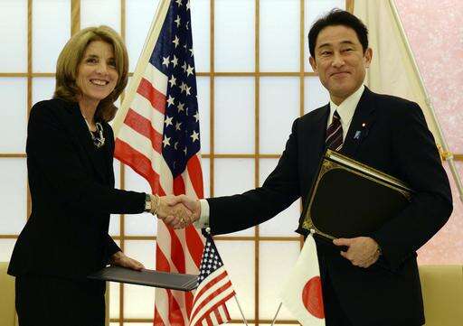 FILE - In this April 23, 2014, file photo, U.S. Ambassador to Japan Caroline Kennedy, left, shakes hands with Japanese Foreign Minister Fumio Kishida after exchanging the documents to extend the agreement on cooperation in research and development in science and technology between the two countries in Tokyo. Kennedy is stepping down Wednesday, Jan. 18, 2017 after three years as U.S. ambassador to Japan, where she was welcomed like a celebrity and worked to deepen the U.S.-Japan relationship despite regular flare-ups over American military bases on the southern island of Okinawa. (Toshifumi Kitamura/Pool Photo via AP, File)