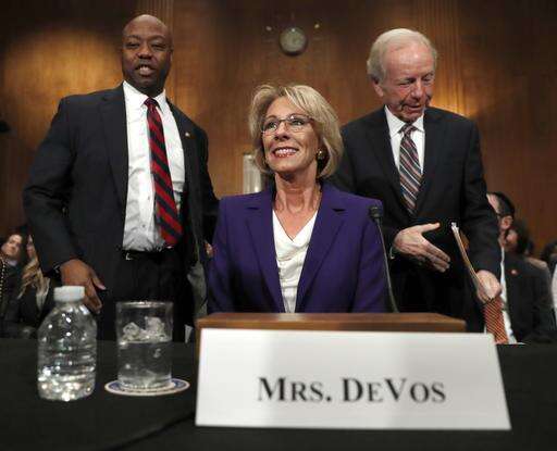 Education Secretary-designate Betsy DeVos talks to Sen. Tim Scott, R-S.C., before testifying on Capitol Hill in Washington, Tuesday, Jan. 17, 2017, at her confirmation hearing before the Senate Health, Education, Labor and Pensions Committee. Scott was to introduce her to the committee. (AP Photo/Carolyn Kaster) The Associated Press