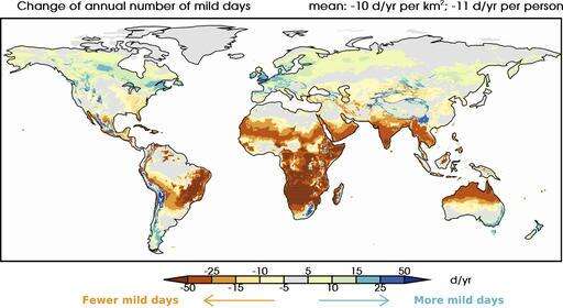 For the past three decades, the world has averaged 74 mild days a year. But by 2035 that will shrink to 70 and then 64 by the last two decades of the century, according to the study, published Wednesday in the journal Climatic Change . Mild weather was defined as between 68 and 86 degrees (18 and 30 degrees Celsius) with low humidity and no more than a trace of rain.