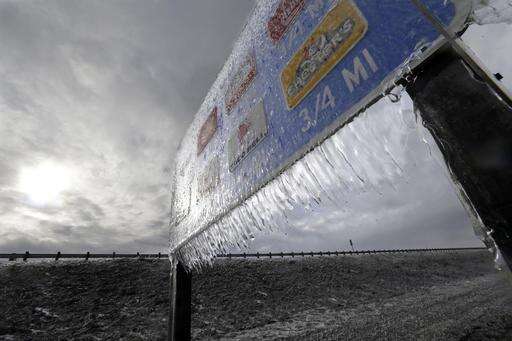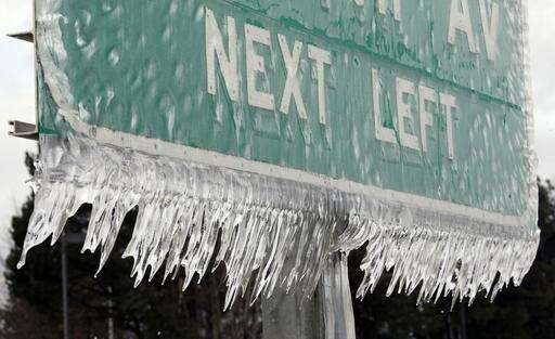 Icicles, formed by freezing rain and stiff winds, hang from a road sign along Interstate 84 in Troutdale, Ore., Wednesday, Jan. 18, 2017. An ice storm shut down parts of major highways and interstates Wednesday in Oregon and Washington state and paralyzed the hardest hit towns along the Columbia River Gorge with up to 2 inches of ice coating the ground in some places. (AP Photo/Don Ryan)