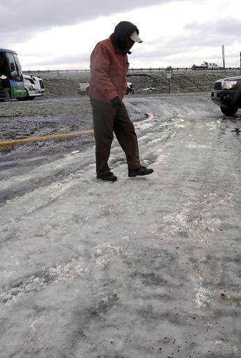 Billy Graham, from Texas, walks carefully on hard packed snow and ice as he makes his way to a restaurant in Troutdale, Ore., Wednesday, Jan. 18, 2017. An ice storm shut down parts of major highways and interstates Wednesday in Oregon and Washington state and paralyzed the hardest hit towns along the Columbia River Gorge with up to 2 inches of ice coating the ground in some places.(AP Photo/Don Ryan)