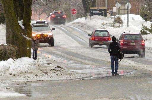 A pedestrian walks into the street to get around an icy sidewalk and a large puddle along Sixth Street on Wednesday, Jan. 18, 2017, in Moscow, Idaho. The region was hit with an ice storm overnight, and is now under a flood watch because of rain and melting snow. (Geoff Crimmins/The Moscow-Pullman Daily News via AP)