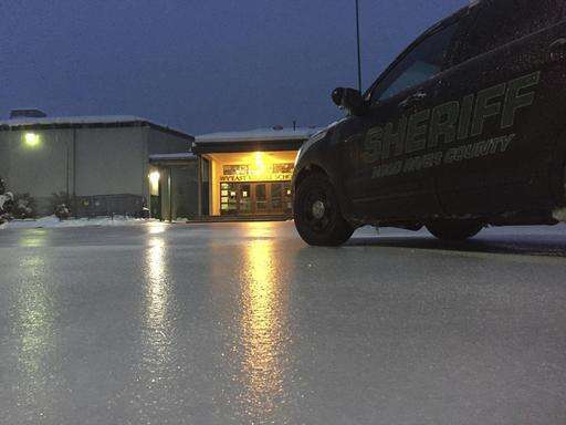 In this image provided by the Hood River County Sheriff, lights from a school reflect off the ice-coated parking lot in Hood River, Ore., Wednesday, Jan. 18, 2017. An ice storm shut down parts of major highways and interstates Wednesday in Oregon and Washington state and paralyzed the hardest hit towns along the Columbia River Gorge with up to 2 inches of ice coating the ground in some places.(Joel Ives/Hood River County Sheriff via AP)