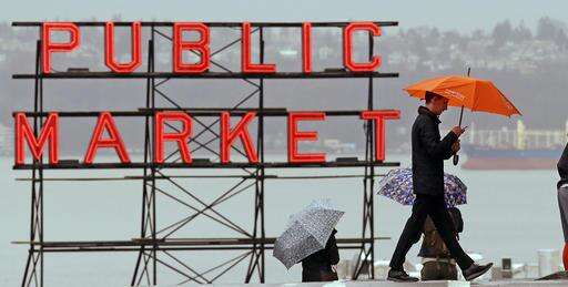 Pedestrians huddle under umbrellas as they walk past the Pike Place Market and in view of Elliot Bay behind, Wednesday, Jan. 18, 2017, in Seattle. Freezing rain, ice and fallen trees forced the closure of highways and roads in Oregon and Washington on Wednesday. Interstate 90, the main highway connecting western and eastern Washington, was to remain closed over Snoqualmie Pass until at least Thursday morning because of hazardous winter conditions. (AP Photo/Elaine Thompson)