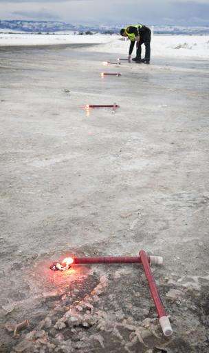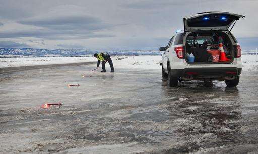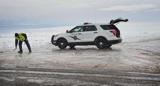 Washington State Patrol Trooper Wes Cook sets up flares Wednesday morning, Jan. 18, 2017, to close Harvey Shaw Road just north of Walla Walla, Wash. Freezing rain, ice and fallen trees forced the closure of highways and roads in Oregon and Washington on Wednesday. (Lehman Photo/Walla Walla Union-Bulletin via AP)