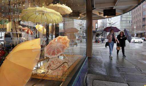 Pedestrians under umbrellas pass a vintage umbrella shop Wednesday, Jan. 18, 2017, in downtown Seattle. Freezing rain, ice and fallen trees forced the closure of highways and roads in Oregon and Washington on Wednesday. Interstate 90, the main highway connecting western and eastern Washington, was to remain closed over Snoqualmie Pass until at least Thursday morning because of hazardous winter conditions. (AP Photo/Elaine Thompson)