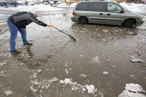 Manager Levi Lenz uses a snow shovel while trying to locate a clogged storm drain in the parking lot outside Anytime Fitness on Wednesday, Jan. 18, 2017, in Moscow, Idaho. The region was hit with an ice storm overnight, and is now under a flood watch because of rain and melting snow. (Geoff Crimmins/The Moscow-Pullman Daily News via AP)