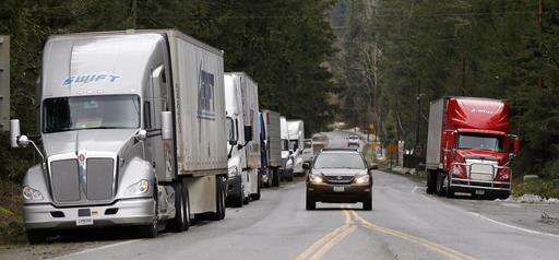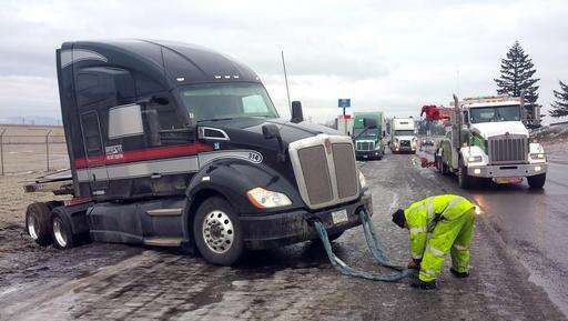 Trucks and other traffic is diverted off of eastbound Interstate 90 before Snoqualmie Pass, Wednesday, Jan. 18, 2017, in North Bend, Wash. An ice storm shut down parts of major highways and interstates Wednesday in Oregon and Washington state and paralyzed the hardest hit towns along the Columbia River Gorge with up to 2 inches of ice coating the ground in some places. In Washington state, I-90, the main highway connecting western and eastern Washington, was to remain closed over Snoqualmie Pass because of hazardous winter conditions. (AP Photo/Elaine Thompson)