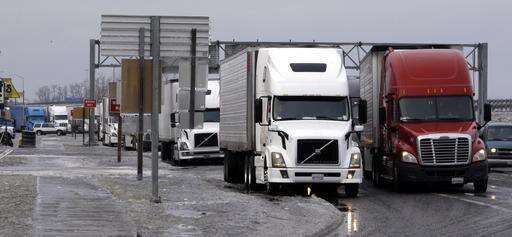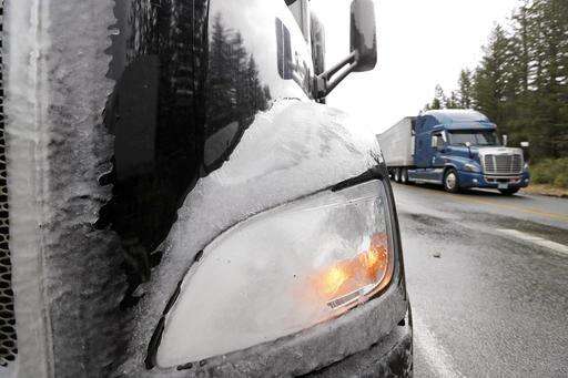 Local traffic passes trucks parked on the shoulder and waiting for eastbound Interstate 90 to open, Wednesday, Jan. 18, 2017, in North Bend, Wash. An ice storm shut down parts of major highways and interstates Wednesday in Oregon and Washington state and paralyzed the hardest hit towns along the Columbia River Gorge with up to 2 inches of ice coating the ground in some places. In Washington state, I-90, the main highway connecting western and eastern Washington, was to remain closed over Snoqualmie Pass because of hazardous winter conditions. (AP Photo/Elaine Thompson)