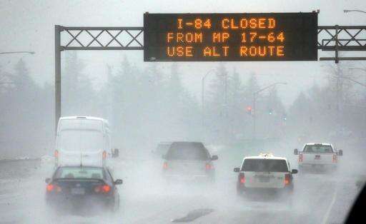 A traffic sign alerts drivers on Interstate 84 in Troutdale, Ore., of road closures, Wednesday, Jan. 18, 2017. An ice storm shut down parts of major highways and interstates Wednesday in Oregon and Washington state and paralyzed the hardest hit towns along the Columbia River Gorge with up to 2 inches of ice coating the ground in some places.(AP Photo/Don Ryan)