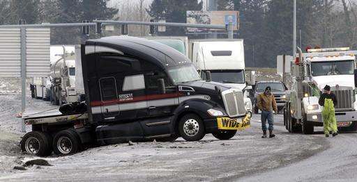 Tow truck driver Donny Callahan prepares to pull a semi truck out of a ditch in Troutdale, Ore., Wednesday, Jan. 18, 2017. An ice storm shut down parts of major highways and interstates Wednesday in Oregon and Washington state and paralyzed the hardest hit towns along the Columbia River Gorge with up to 2 inches of ice coating the ground in some places. (AP Photo/Don Ryan)