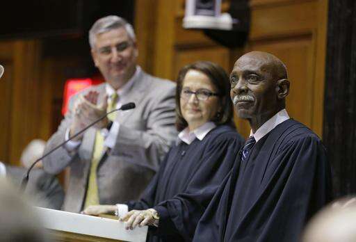 Indiana Supreme Court Justice Robert Rucker, right, is introduced after Chief Justice Loretta H. Rush, center, announced his impending retirement as she delivered her State of the Judiciary address to a joint session of the legislature at the Statehouse in Indianapolis, Wednesday, Jan. 18, 2017. Gov. Eric Holcomb is at the left. Rucker will retire this year after 18 years on the court. (AP Photo/Michael Conroy) The Associated Press