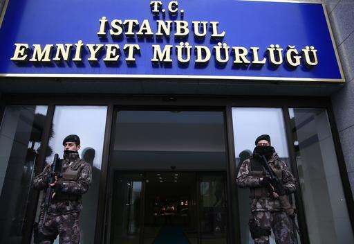 Turkish police officers stand guard at Istanbul's headquarters following a news conference regarding the arrest of a suspect of New Year's nightclub attack in Istanbul, Tuesday, Jan. 17, 2017. Turkish officials on Tuesday confirmed that the gunman who carried out the deadly New Year's attack on an Istanbul nightclub, which was claimed by the Islamic State group, has been detained. The sign reads in Turkish: "Istanbul Police Department'." (AP Photo/Lefteris Pitarakis)