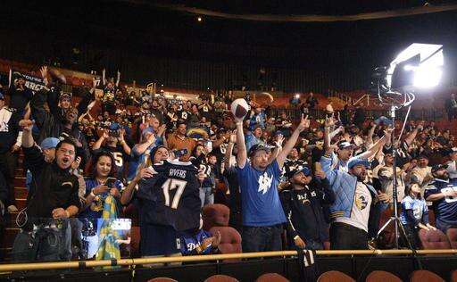 The crowd reacts after an NFL football news conference to introduce the Los Angeles Chargers to the Los Angeles area, in Inglewood, Calif., Wednesday, Jan. 18, 2017. (AP Photo/Kelvin Kuo) The Associated Press