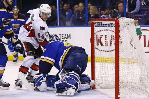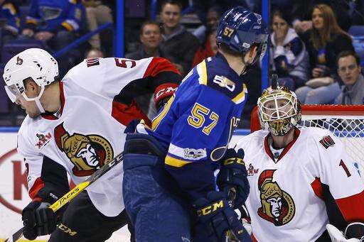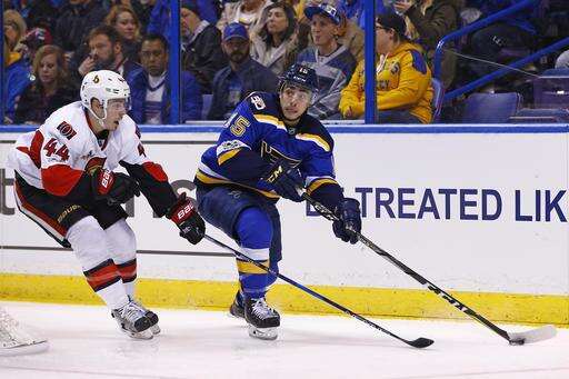 NOTES: The Blues lost D Brad Hunt after Nashville claimed him on waivers. ... F Berglund played in his 600th game as a Blue. ... Senators G Craig Anderson (personal leave) is expected to be away for at least a couple of more weeks. He is with his wife, who is battling cancer. .. Senators F Clarke MacArthur (concussion) is undergoing tests in Ottawa.