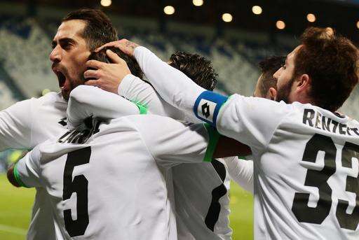 Cesena's Karim Laribi, left, celebrates with teammates after scoring during the Italian Cup, Round of 16 soccer match between Sassuolo and Cesena, at the Mapei stadium in Reggio Emilia, Italy, Wednesday, Jan. 18, 2017. (Elisabetta /ANSA via AP)