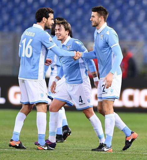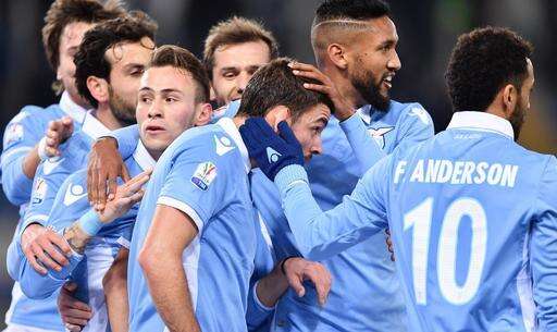 Lazio's Filip Djordjevic, center, celebrates with his teammates after scoring during the Italian Cup, Round of 16 soccer match between Lazio and Genoa at the Rome Olympic stadium Wednesday, Jan. 18, 2017. (Ettore Ferrari/ANSA via AP)