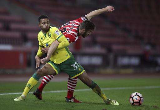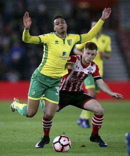 Norwich City's Josh Murphy, left, and Southampton's Sam McQueen in action during their English FA Cup, third round replay soccer match at St Mary's in Southampton, England, Wednesday Jan. 18, 2017. (Nick Potts/PA via AP)