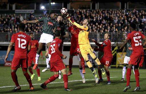 Plymouth Argyle's Yann Songo'o, top left, and Liverpool goalkeeper Loris Karius battle for the ball during their English FA Cup, third round replay match against Plymouth Argyle at Home Park, Plymouth, England, Wednesday Jan. 18, 2017. (Andrew Matthews/PA via AP)