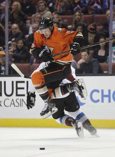 Anaheim Ducks' Cam Fowler, top, jumps to avoid a collision with Colorado Avalanche's Gabriel Landeskog, of Sweden, during the first period of an NHL hockey game Thursday, Jan. 19, 2017, in Anaheim, Calif. (AP Photo/Jae C. Hong) The Associated Press