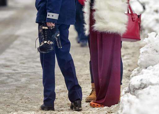 A policewoman holds a pair of high heel boots belonging to a clubber standing next to her who came to retrieve belongings, after firefighters put out a fire that erupted in the early hours at the upmarket Bamboo nightclub, in Bucharest, Romania, Saturday, Jan 21, 2017. Fire engulfed a popular nightclub in the Romanian capital Saturday, sending more than 40 people to hospitals for treatment including one who was seriously injured. No deaths were reported.(AP Photo/Andreea Alexandru)