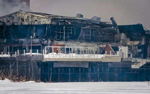 A firefighter stands on the terrace of the smoldering compound, after a fire erupted in the early hours at the upmarket Bamboo nightclub, in Bucharest, Romania, Saturday, Jan 21, 2017. Fire engulfed a popular nightclub in the Romanian capital Saturday, sending more than 40 people to hospitals for treatment including one who was seriously injured. No deaths were reported.(AP Photo/Andreea Alexandru)