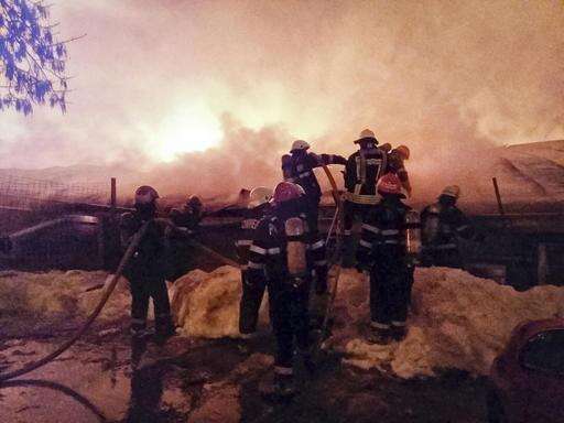 In this image provided by the Romania's General Inspectorate for Emergency Situations (ISU), firefighters approach the burning compound after a fire erupted in the early hours at the upmarket Bamboo nightclub, in Bucharest, Romania, Saturday, Jan. 21, 2017. Fire engulfed a popular nightclub in the Romanian capital Saturday, sending at least 40 people to hospitals for treatment including one who was seriously injured. No deaths were reported. (ISU via AP)