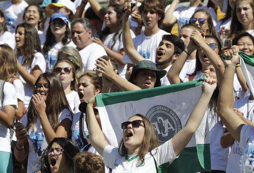 Chapecoense soccer team fans cheer during a team's training session at the Arena Conda stadium in Chapeco, Brazil, Friday, Jan. 20, 2017. Three Chapecoense players survived and 19 players perished in an air crash that killed 71 people almost two months ago in Colombia. (AP Photo/Andre Penner)