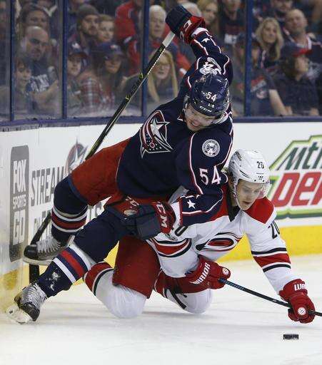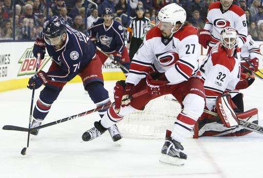 NOTES: Columbus killed five of six penalties in the game. ... LW Matt Calvert was a healthy scratch for Columbus, and D David Savard and D Markus Nutivaara were out with injuries. Little-used D Dalton Prout and Scott Harrington were in the lineup, making up the third defensive pair. Both got assists on Hartnell's first-period goal, and Prout got another on Hartnell's goal in the third. ... Carolina D Noah Hanifin, D Matt Tennyson and LW Teuvo Teravainen were benched after the team's loss to Pittsburgh Friday night. ... Alex Nedeljkovic, who replaced Ward during Carolina's loss to Columbus on Tuesday, was sent back to Carolina in favor of Leighton. ... Columbus D Ryan Murray played his 200th NHL game. ... Columbus is 4-5-0 since its franchise-record 16-game winning streak ended.