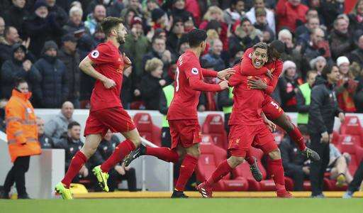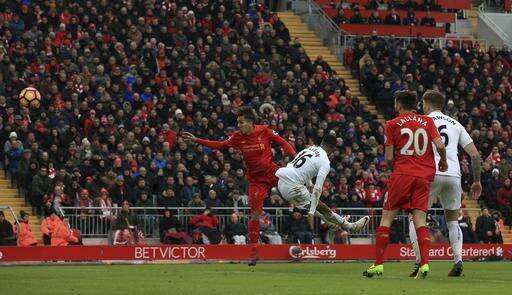 Liverpool's Roberto Firmino, center, scores his side's first goal of the game during the English Premier League soccer match between Liverpool and Swansea City at Anfield, Liverpool, England, Saturday, Jan. 21, 2017. (Peter Byrne/PA via AP) The Associated Press