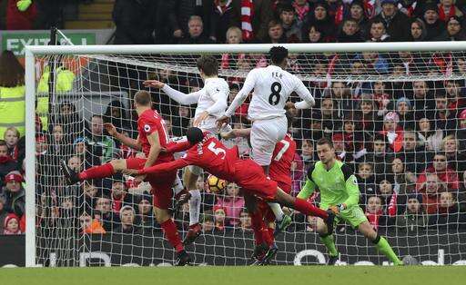 Swansea City's Fernando Llorente, center, left, scores his side's second goal of the game during the English Premier League soccer match between Liverpool and Swansea City at Anfield, Liverpool, England, Saturday, Jan. 21, 2017. (Peter Byrne/PA via AP) The Associated Press