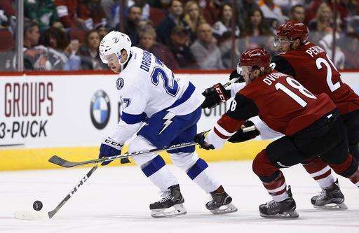 Tampa Bay Lightning left wing Jonathan Drouin (27) skates with the puck against Arizona Coyotes center Christian Dvorak (18) and left wing Brendan Perlini, right, during the first period of an NHL hockey game Saturday, Jan. 21, 2017, in Glendale, Ariz. (AP Photo/Ross D. Franklin) The Associated Press