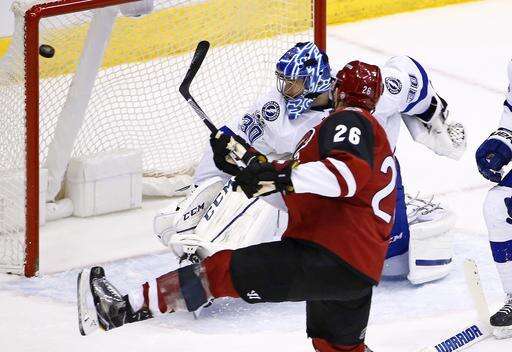 Arizona Coyotes defenseman Michael Stone (26) scores a goal against Tampa Bay Lightning goalie Ben Bishop (30 during the second period of an NHL hockey game Saturday, Jan. 21, 2017, in Glendale, Ariz. (AP Photo/Ross D. Franklin) The Associated Press