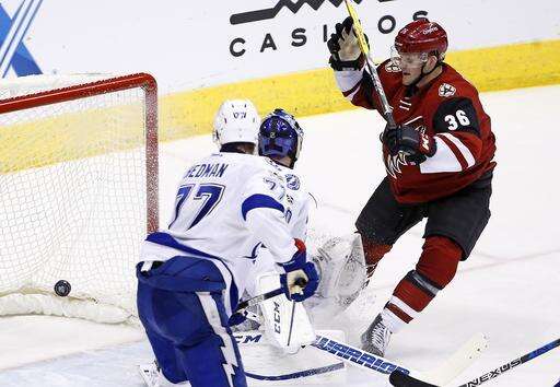 Arizona Coyotes right wing Christian Fischer (36) scores in his first NHL hockey game as the gets the puck past Tampa Bay Lightning defenseman Victor Hedman (77) and goalie Ben Bishop during the second period Saturday, Jan. 21, 2017, in Glendale, Ariz. (AP Photo/Ross D. Franklin) The Associated Press