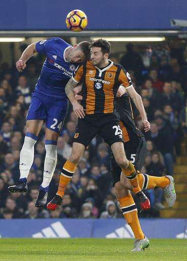 Chelsea's Gary Cahill, left, and Hull City's Ryan Mason challenge for the ball during the English Premier League soccer match between Chelsea and Hull City at Stamford Bridge stadium in London, Sunday, Jan. 22, 2017. (AP Photo/Frank Augstein) The Associated Press