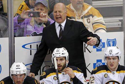 Boston Bruins head coach Claude Julien motions to an official during the first period of an NHL hockey game against the Pittsburgh Penguins in Pittsburgh, Sunday, Jan. 22, 2017. (AP Photo/Gene J. Puskar)